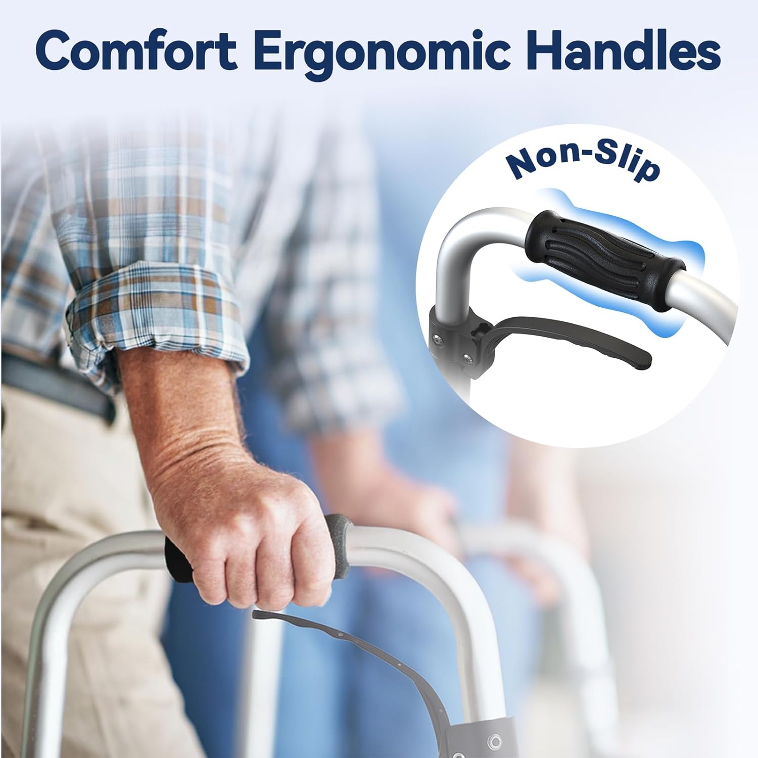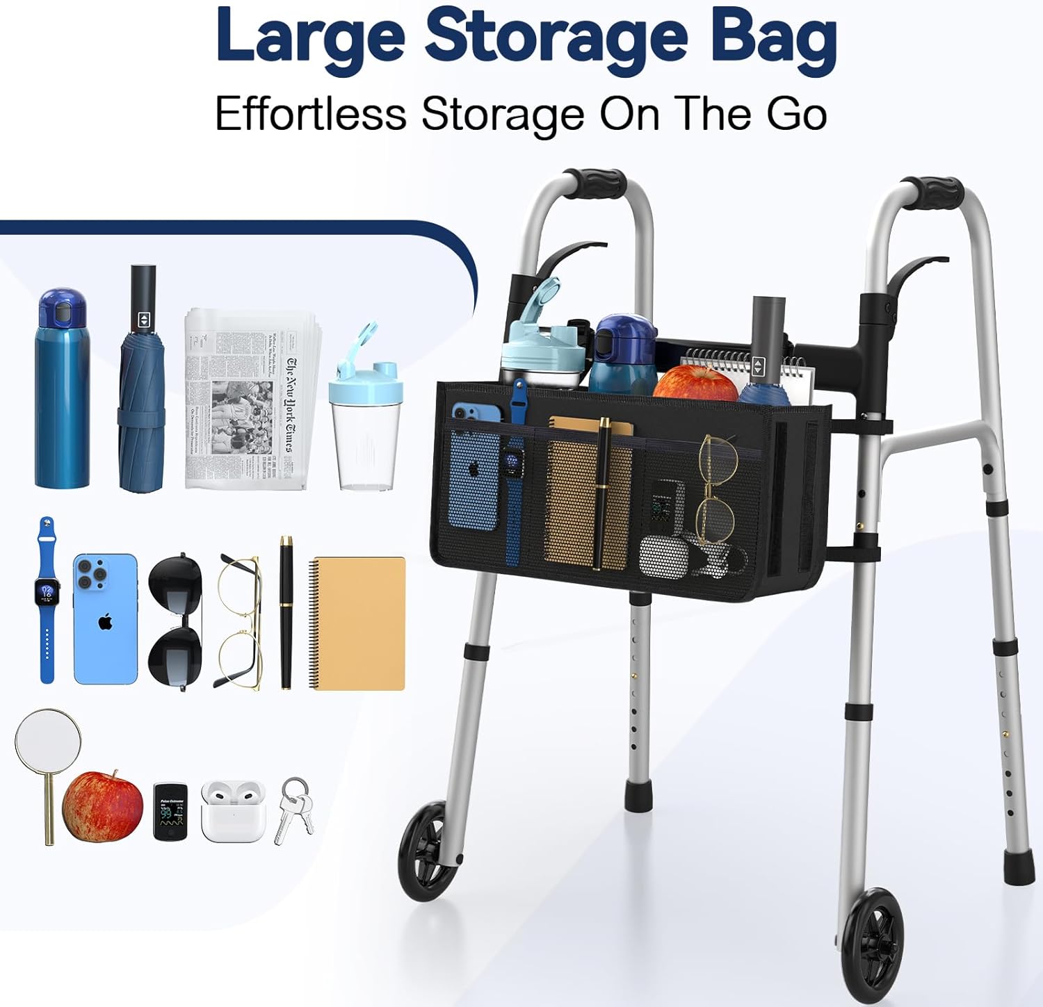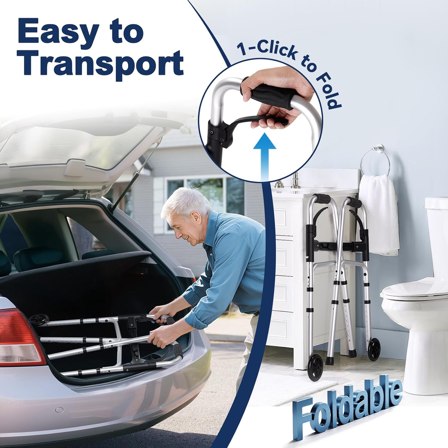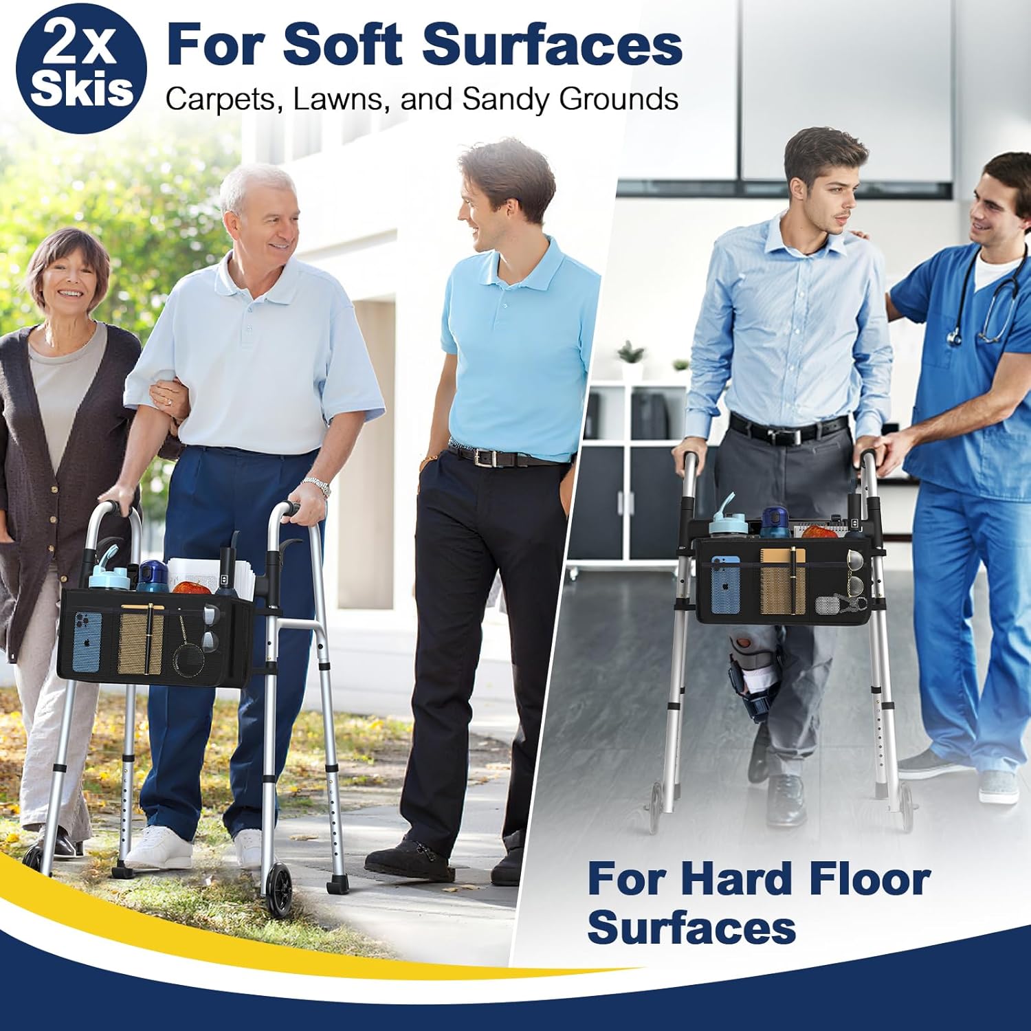 Folding Walkers for Seniors with Basket and Glide Skis, 5" Wheels Lightweight Rolling Walker, Support Up to 350 lbs, Height Adjustable Standard Compact Walker, Black